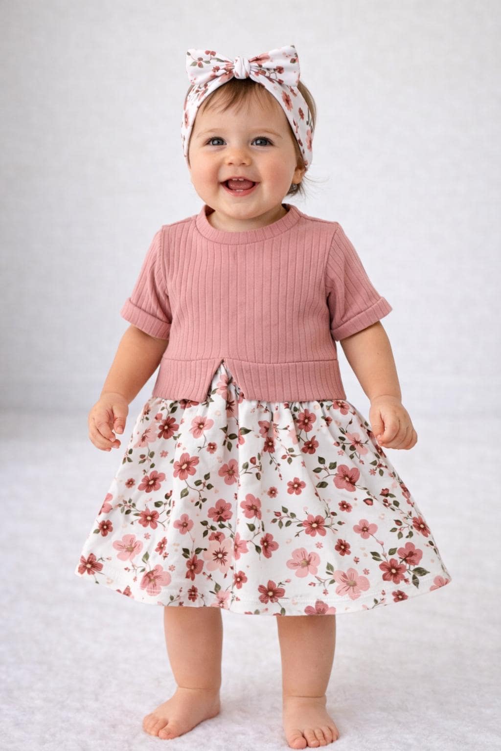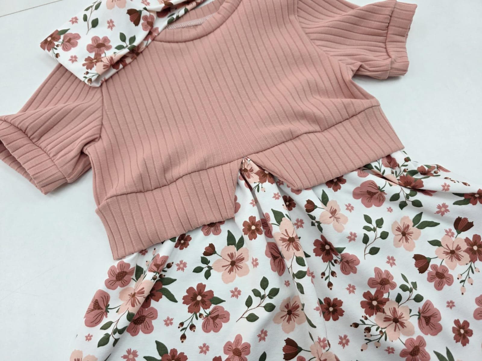 The soft, ribbed top in antique rose combined with the playful floral skirt creates a modern yet timeless look.